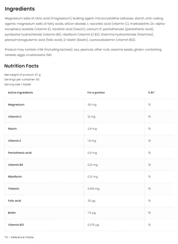 Izvirna cena je bila: 3,99 €.3,19 €Trenutna cena je: 3,19 €.OstroVit Magnesium MAX + Vitamins je celovito prehransko dopolnilo, ki vsebuje magnezij in dragocene vitamine. Je pripravek, ki je na voljo v obliki tablet, ki jih je enostavno pogoltniti, namenjen ljudem, ki želijo svojo dnevno prehrano dopolniti z dragocenimi spojinami.