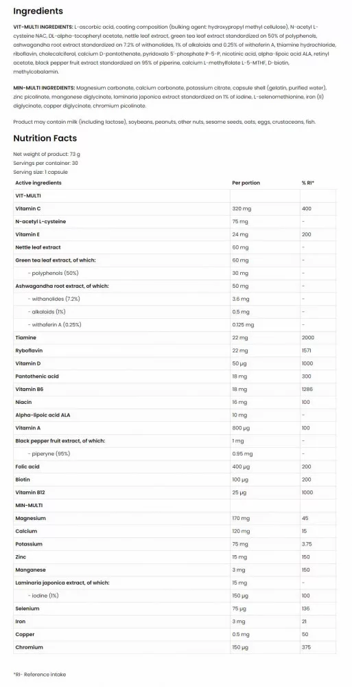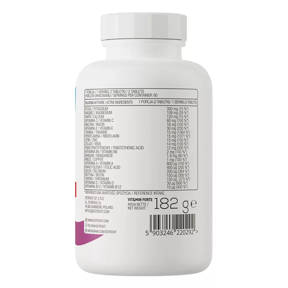 Vsebuje kar 21 snovi – vitaminov in mineralov.OstroVit Vit Min Forte je celovito prehransko dopolnilo, ki vsebuje kar 21 snovi – vitaminov in mineralov. Je pripravek, ki je na voljo v obliki tablet, ki jih je enostavno pogoltniti in je namenjen ljudem, ki želijo svojo dnevno prehrano dopolniti z dragocenimi sestavinami.